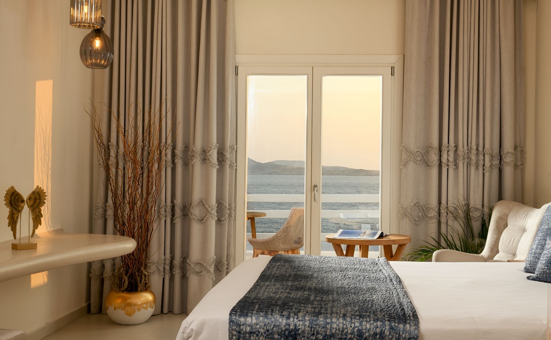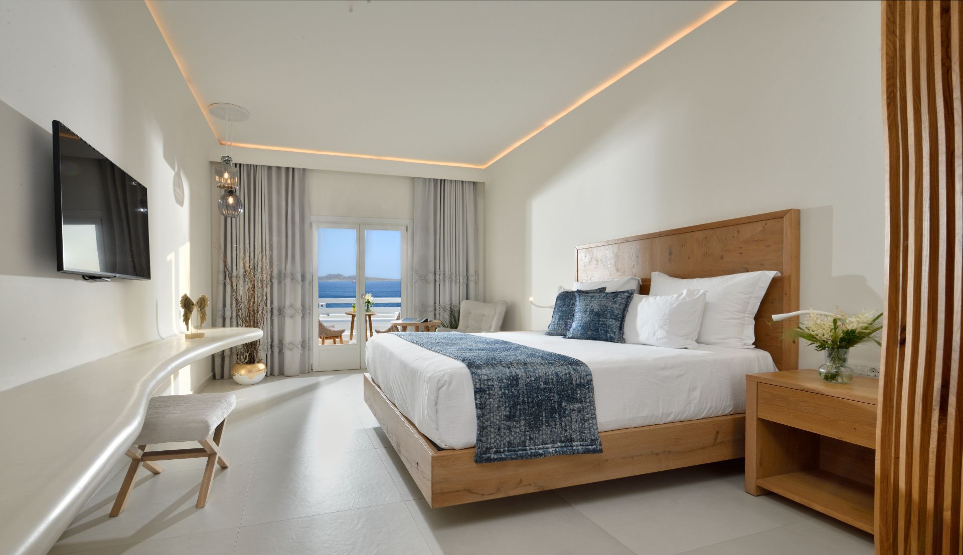 Delicate lines of Cycladic architecture, luxurious simplicity and high aesthetics are the main characteristics of the white serenity of the Exclusive Suite...