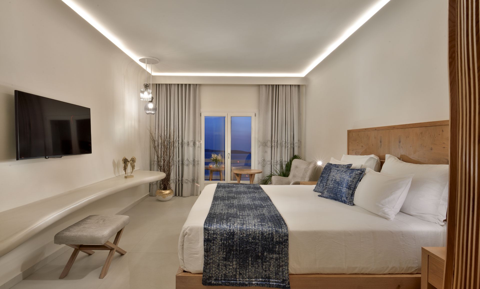 Delicate lines of Cycladic architecture, luxurious simplicity and high aesthetics are the main characteristics of the white serenity of the Anax Suite...