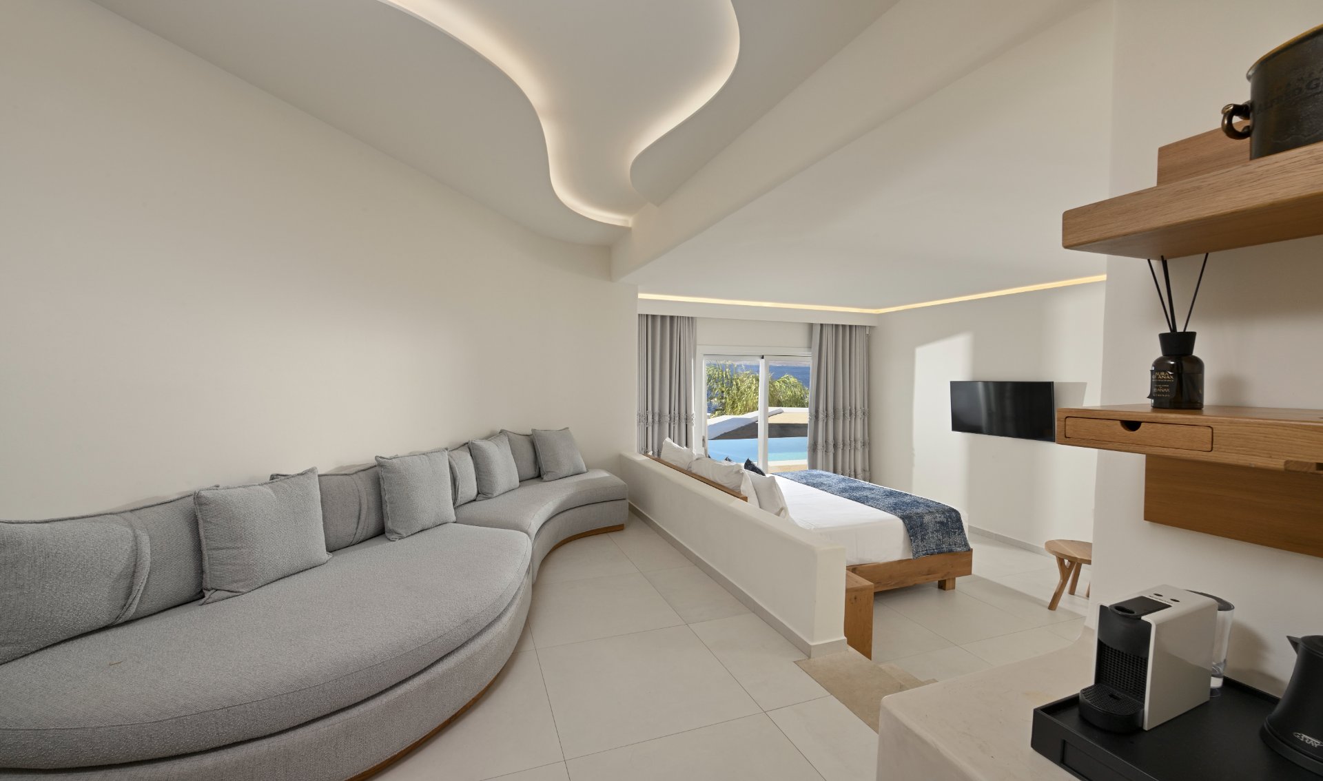 Delicate lines of Cycladic architecture, luxurious simplicity and high aesthetics are the main characteristics of the white serenity of the Anax Suite...
