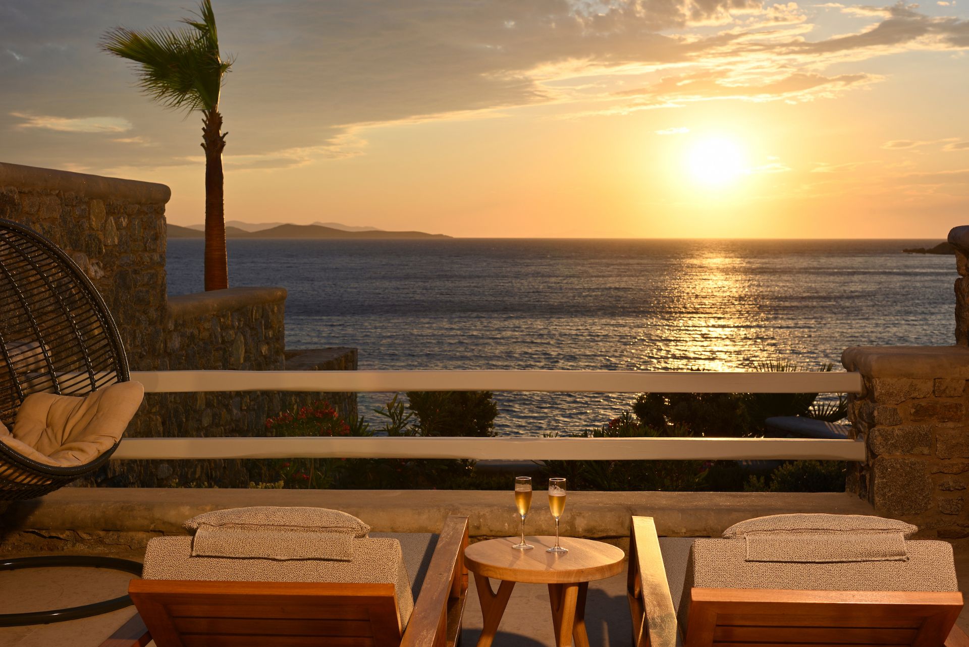 Beamed ceilings, Separate sitting area, Private bathroom with Jacuzzi, Walk in shower, earth-toned textiles and wooden furniture introduce a healthy dose of laid-back Mykonian cool to the suite. World class amenities and delicate fabrics offer a cozy yet luxurious environment for guests who want well appointed spaces to indulge to themselves.